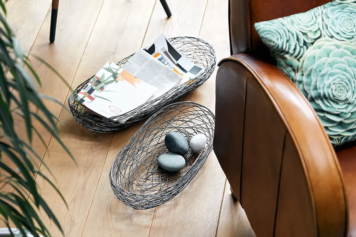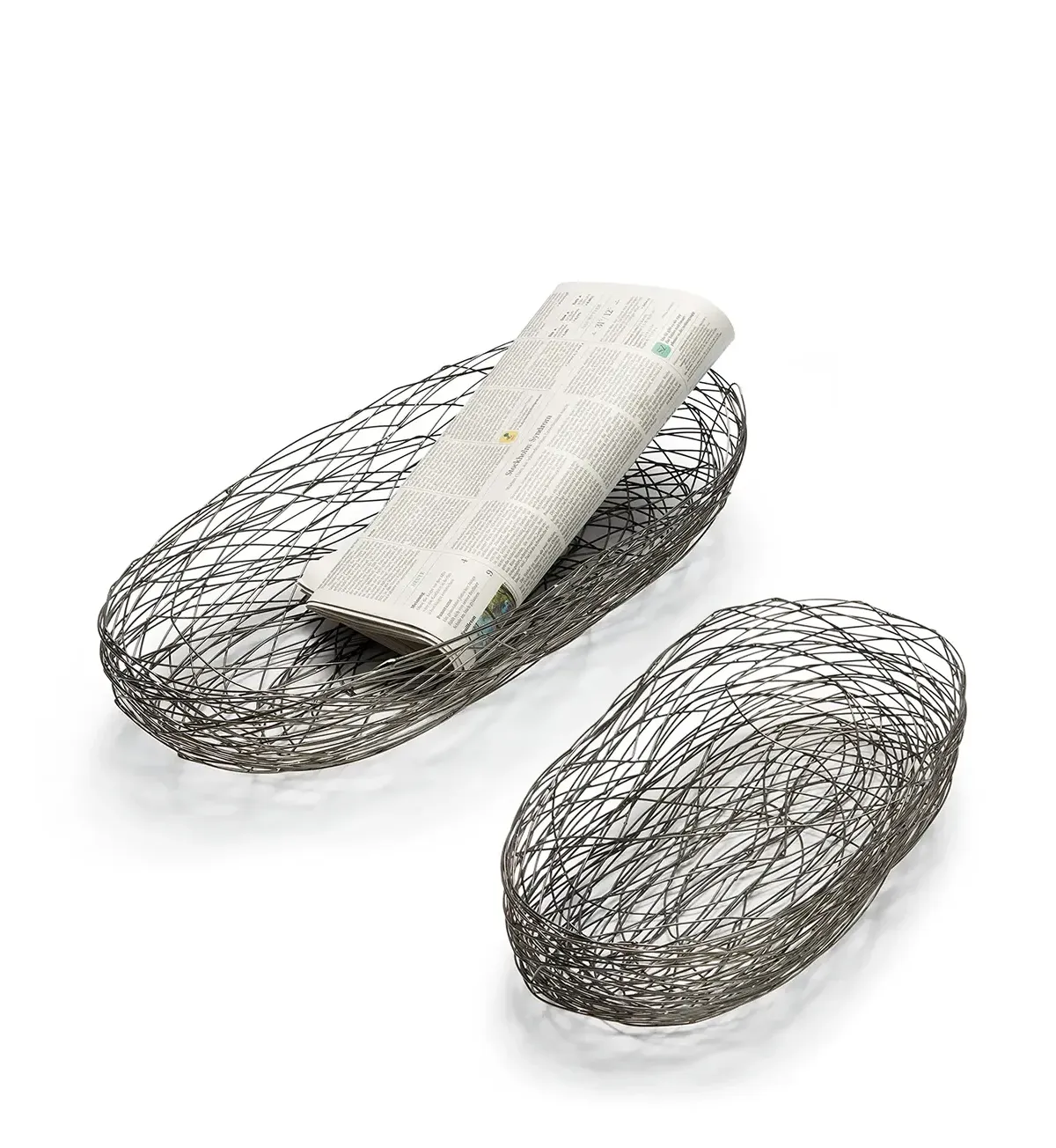 Fascinujúce koše sú veľmi originálne a jedinečné. Každý kôš je ručne navinutý z jedného kusu drôtu- čiernej niklovanej nerezovej ocele. Svojím vzhľadom pripomína vtáčie hniezdo a stáva sa moderným doplnkom.