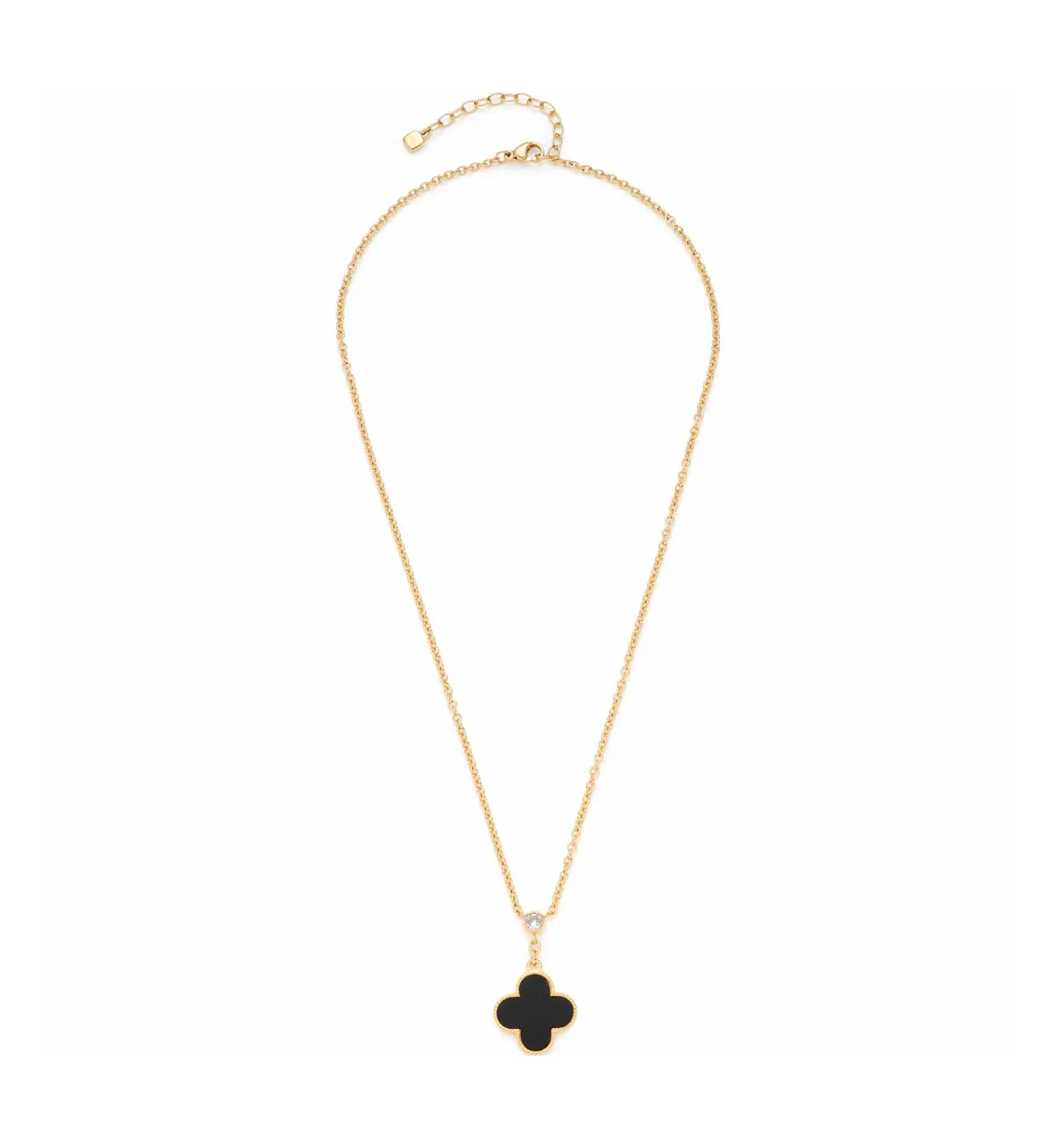 Náhrdelník s príveskom v tvare abstraktného štvorlístka, ktorý je upevnený na čírom zirkónovom kameni zavesenom uprostred retiazky. Ónyxový prívesok má jemný tesaný okraj.