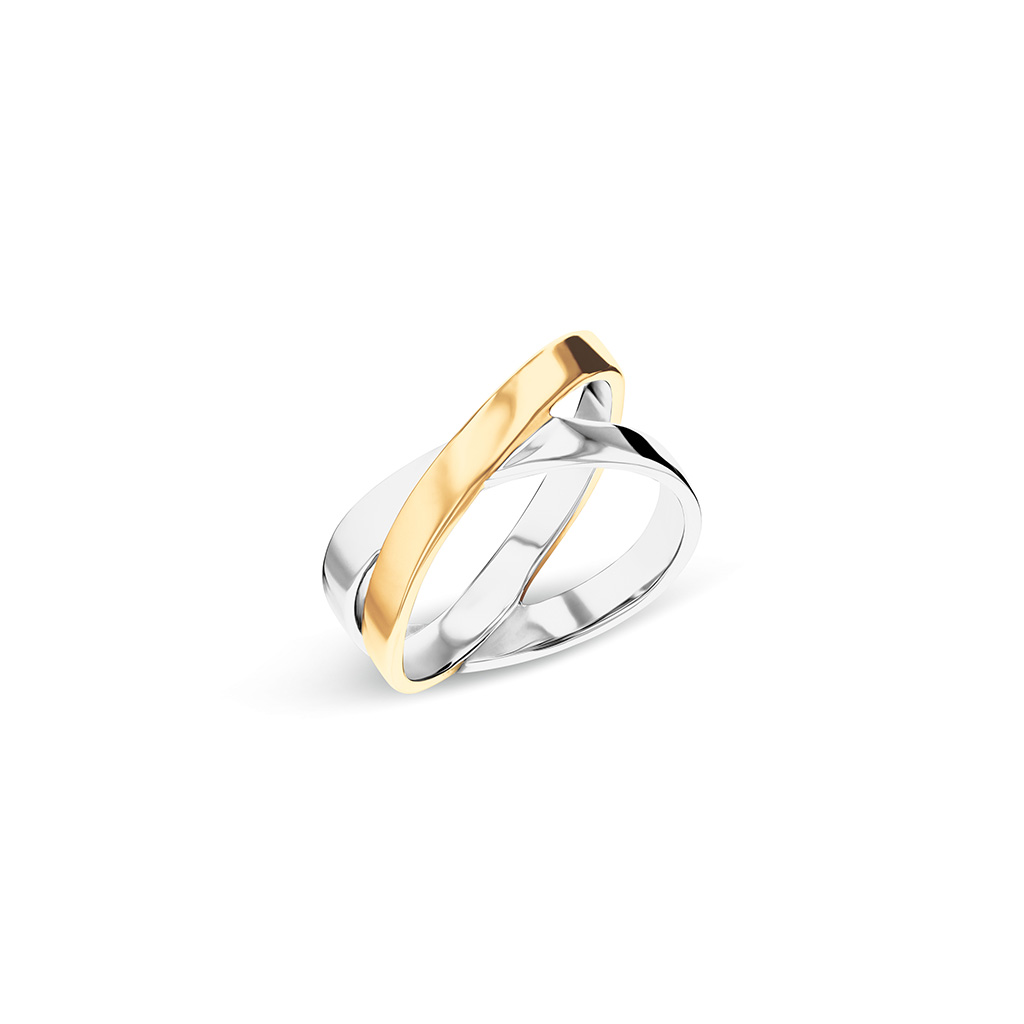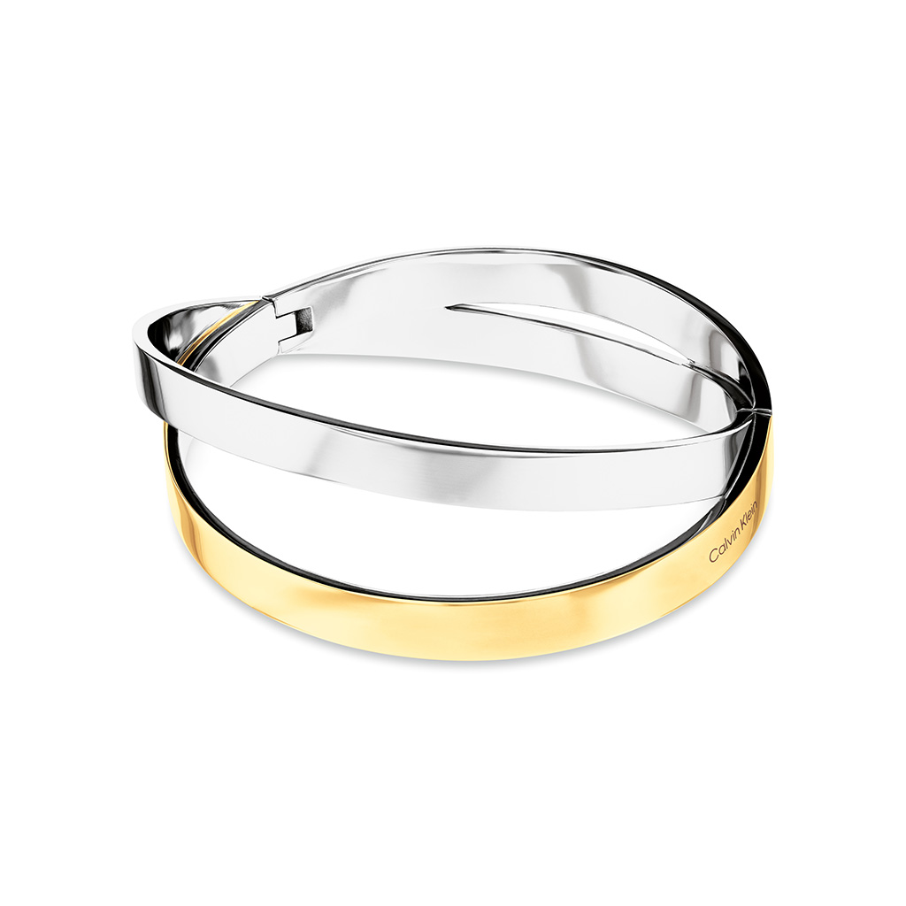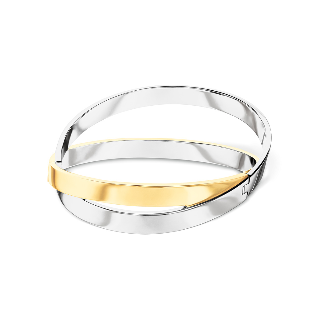 Štýlový dámsky pevný náramok vyrobený z kvalitnej ocele v bicolor prevedení, čiastočne pokovaný zlatým PVD povlakom.