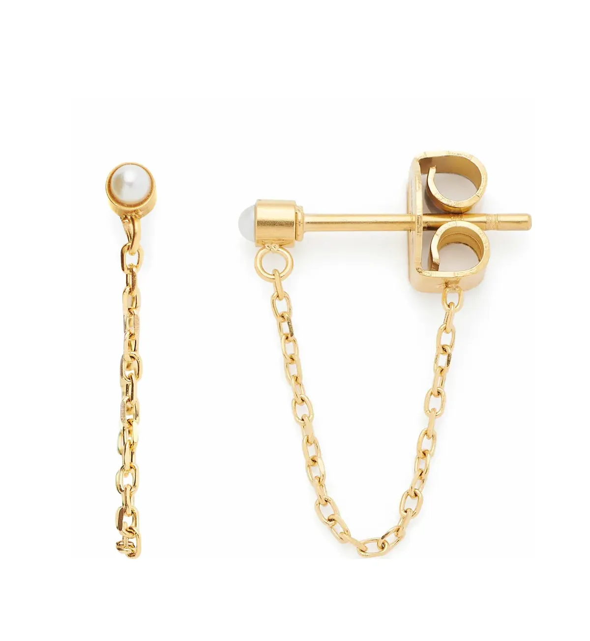 Elegantné mini napichovacie náušnice s jemnou imitáciou perly a jemnou retiazkou. Retiazka pri nosení prechádza okolo ušného lalôčika, čím vytvára sofistikované spojenie a zvláštny vzhľad. Tieto malé šperky sú krásnym doplnkom moderného štýlu.