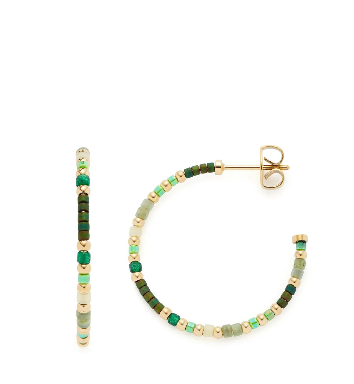 Kruhové náušnice s drobnými mini zelenými korálkami v rôznych odtieňoch zelenej. Drobné japonské sklenené korálky Miyuki Delica zoradené tesne vedľa seba a zlaté iónové mini korálky z nehrdzavejúcej ocele vytvárajú harmonickú súhru.